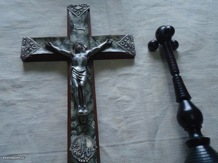 Preço: 30 €Crucifixo antigo de parede de madeira e prata e peça de pau preto