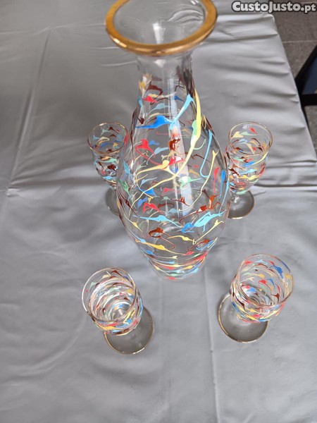 Preço: 60 €Decanter com 4 cálices em vidro soprado de Murano, anos 60