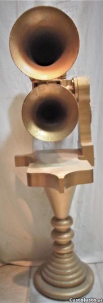 Duas Buzinas a ar recuperadas de antigo navio. As mesmas estão assentes em base maciça de madeira torneada, tudo pintado na cor ouro. Altura da base de madeira 60 Cm. Altura total da peça 105 Cm. Preço 175 Euros