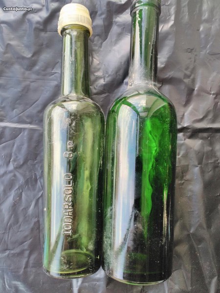 vendo garrafas antigas IODARSOLO B12 deveria de ser de iodo com vitamina B12 são 2 modelos de garrafa diferentes , a primeira é mais pequena e estreita e diz ao alto IODARSOLO B12 em alto relevo a segunda é um bocado maior e mais larga , não diz nada no corpo mas base diz também IODARSOLO B12 todas impecáveis 5EUR cada uma
