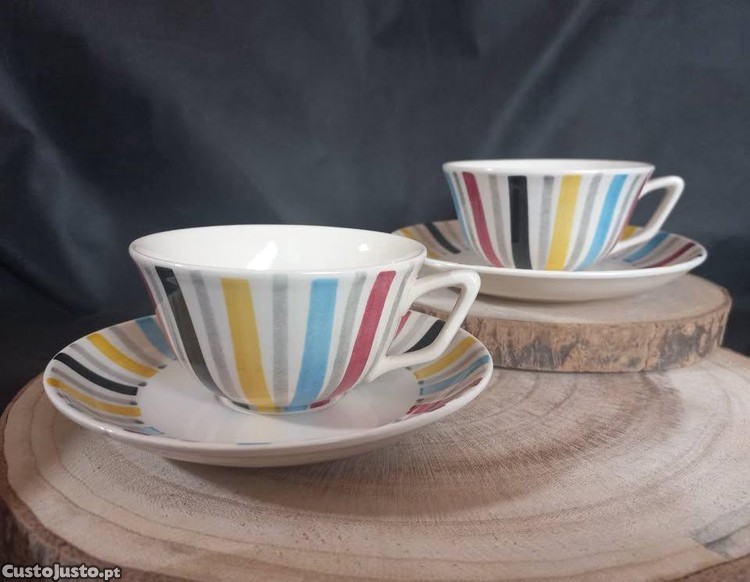 Lindíssimo par de Chávenas de Chá em porcelana Francesa Villeroy & Boch colecção Marlene. Esta colecção é conhecida pelo seu design elegante e intemporal com um padrão de linhas verticais coloridas com tons de Vermelho, Preto, Cinza, Amarelo e Azul.