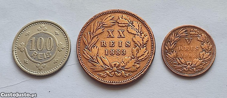 Preço: 6 €Moedas 100 Reis 1900, XX Reis 1883 e V Reis 1882