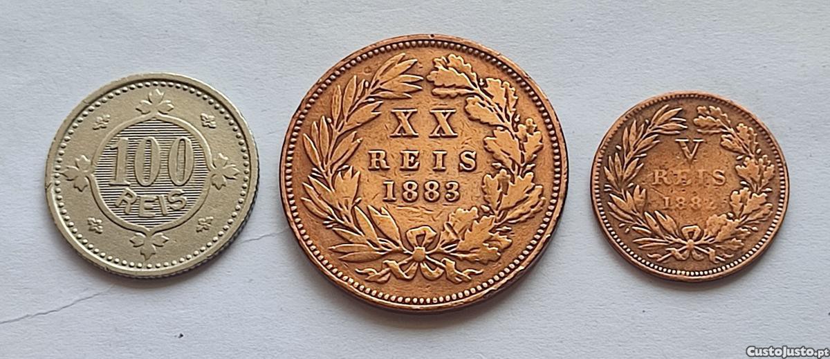 Moedas 100 Reis 1900, XX Reis 1883 e V Reis 1882