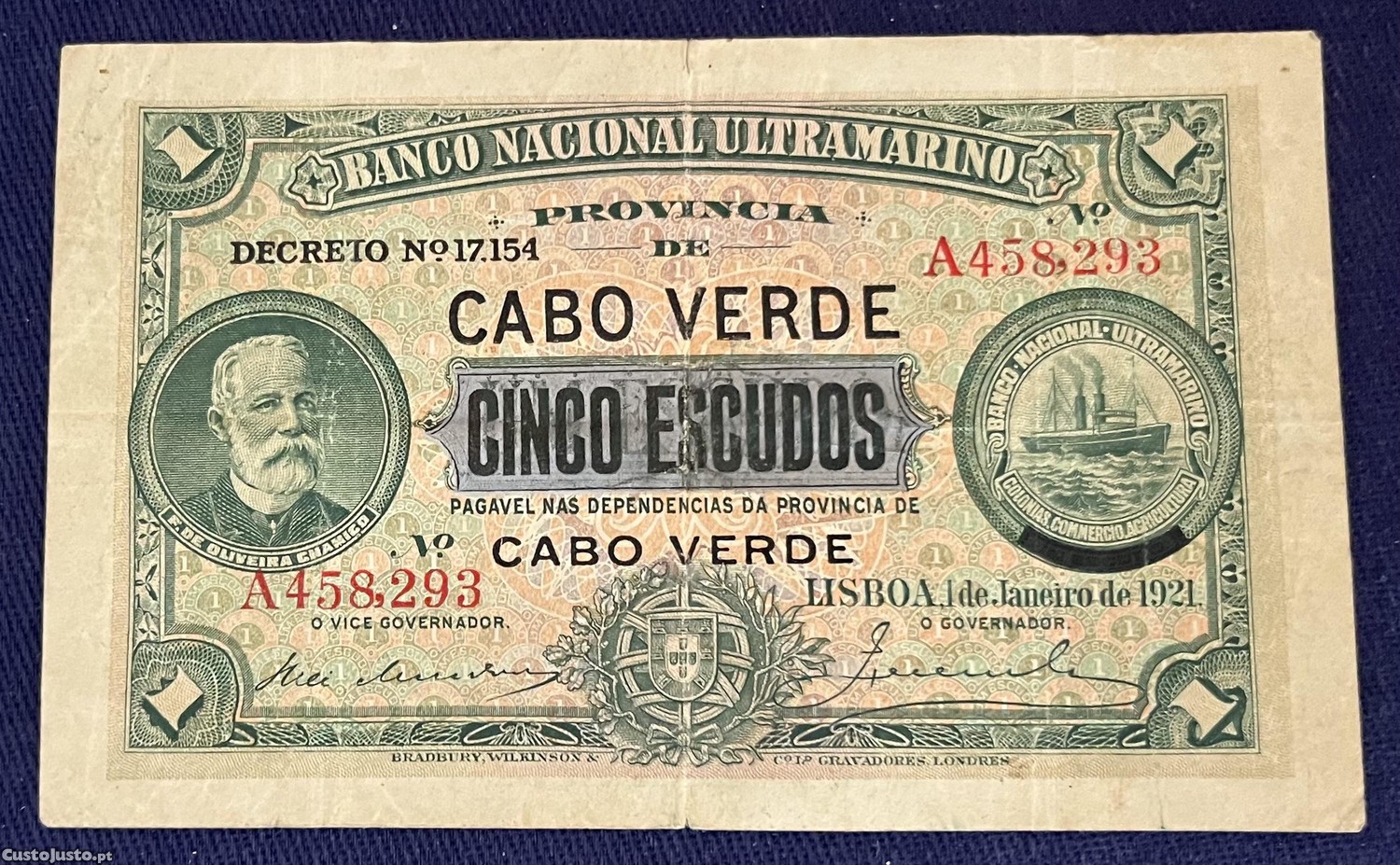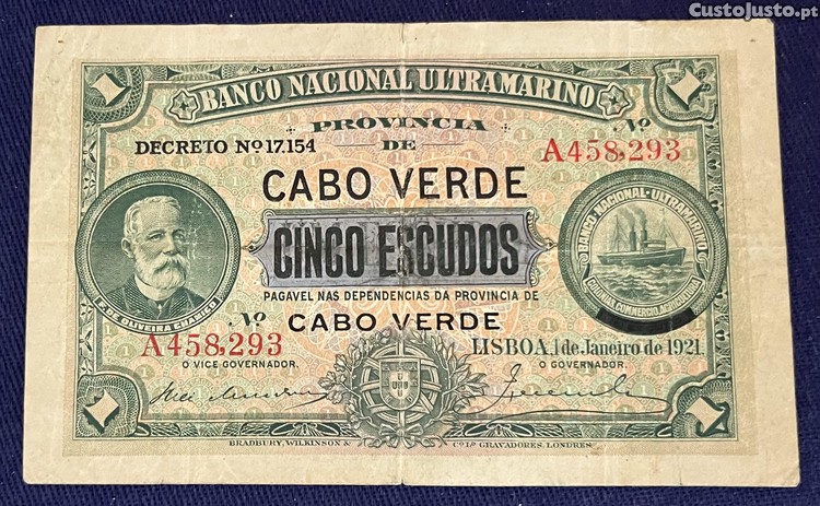 Nota de Cabo Verde 5 escudos de 1921, sobre nota de um escudo