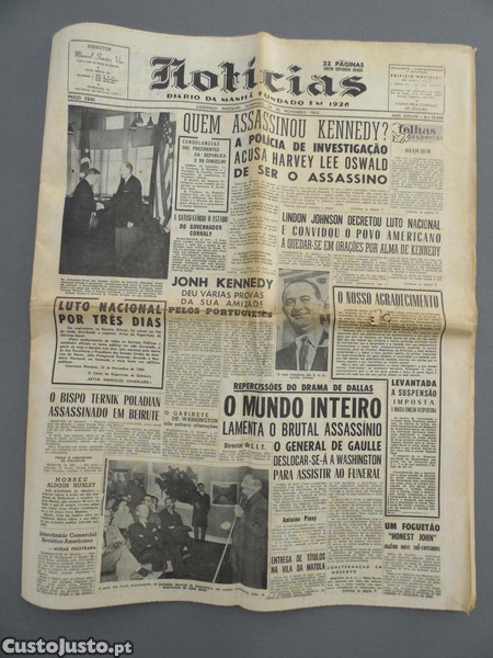 Jornal Notícias, Lourenço Marques, Domingo, 24 de Novembro de 1963 - Histórica Edição sobre o Assassinato de John Fitzgerald Kennedy, Presidente dos Estados da América. 57x45cm, 32 Pags.
