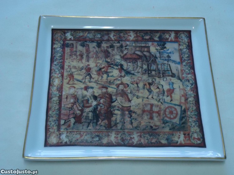 Prato quadrado em porcelana com reproduçao de tapeçaria da colecçao D Joao de Castro