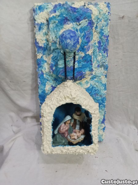 Presépio original 1 cabana pendorada em base de madeira pintada em tons azuis e brancos. Altura da base 40 Cm. Largura 20 Cm. Imagens dos Santos em louça. Preço 35 Euros