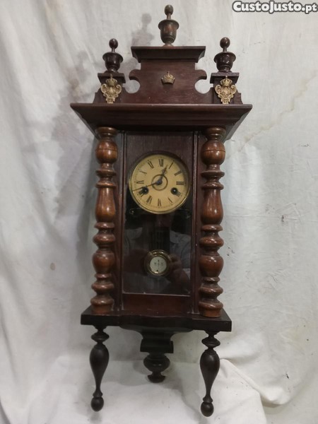 Relógio de parede caixa em madeira. Relógio a trabalhar. Altura total da caixa 70 Cm. Largura máxima 30 Cm. Na caixa foram aplicadas 3 coroas em latão. Preço 65 Euros