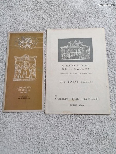 Programas em boas condições. O Programa da Temporada de Ópera 1981-1982 encontra-se sublinhado. O Programa de 1968 é referente ao The Royal Ballet no Teatro Nacional de S. Carlos. O preço apresentado é para o conjunto. Envio grátis em correio normal. Envio em correio registado acresce 2,00 euros. Pode ser entregue em mão no Barreiro. Se tiver dúvidas não hesite em perguntar. Master Watson.