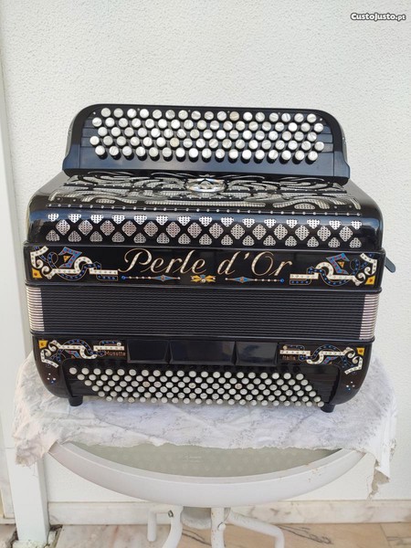Vendo acordeon Perle d'or estado novo, raramente usado, apenas uso particular por pessoa idosa. O acordeon foi comprado ao fabricante, Sr Rocha em Ferreira do Zêzere. Não tem folgas, fugas ar, está como novo. É á quarta voz na mão direita e quinta nos baixos. Tamanho 42 cm largura, 25 cm profundidade e 40 cm altura. (917371812).