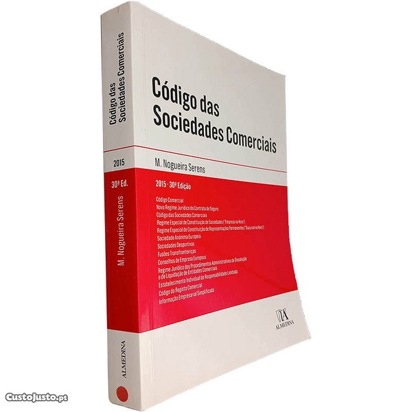 Código das Sociedades Comerciais (2015) M. Nogueira Serens Livraria Almedina 30.ª Edição. Código comercial / Novo regime jurídico do contrato de seguro / Código das sociedades comerciais / Regime especial de constituição de sociedades ( Empresa na Hora ) / Regime especial de constituição de representações permanentes ( Sucursal na Hora ) / Sociedade Anónima Europeia / Sociedades desportivas / Fusões transfronteiriças / Conselho de empresa europeus / Regime jurídico dos procedimentos administrativos de dissolução e de liquidação de entidades comerciais / Estabelecimento individual de responsabilidade limitada / Código do Registo Comercial / Informação empresarial simplificada. CB32