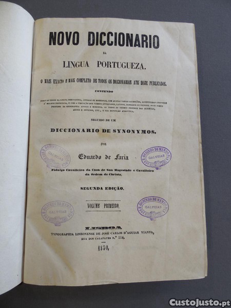 Novo Diccionário da Lingua Portugueza, por Eduardo de Faria, Segunda Edição - Volume Primeiro, Lisboa, Typographia Lisbonense, 1850, dedicado a Sua Magestade El-Rei o Senhor Dom Fernando II, c. 1021 Pags., em muito bom estado para os seus mais de 170 anos
