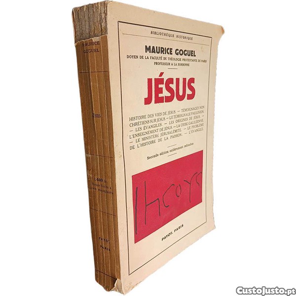 Jésus Maurice Goguel Payot Paris Bibliothèque Historique Edição em francês Histoire des vies de Jésus / Témoignages non chrétiens sur Jésus / Le témoignage Paulinien / Les évangiles / Les origines de Jésus / L Enseignement de Jésus / La crise galiléenne / Le ministère Jérusalémite / Le problème de l histoire de la passion / L Évangile. Com defeito no canto superior da lombada. 6B23