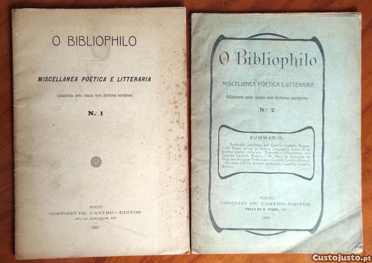 Miscellanea Poetica e Litteraria. Collaborada pelos mais distinctos escriptores. Número 1, Porto, 1907 e número 2, Porto, 1909. (Completa). Editada por Godinho de Castro, apresente textos de Almeida Garrett, Camilo Castelo Branco e Pinho Leal. Exemplares brochados e em bom estado. Publicação muito rara. Peça de colecção.