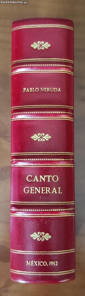 1 - " Canto General ". Mexico. 1952. Conforme o colofon: «Esta segunda edicion del Canto General de Pablo Neruda es reproducción facsimilar de la especial y limitada que al cuidado de Miguel Prieto, se imprimió en los Talleres Gráficos de la Nación. Se ha hecho una tirada de 5.000 ejemplares en Offset Altamira. Com uma fotografia do autor no início da obra. Exemplar encadernado com os cantos em pele vermelha, bem como a lombada, com nervuras e os dizeres dourados. 100 EUR.