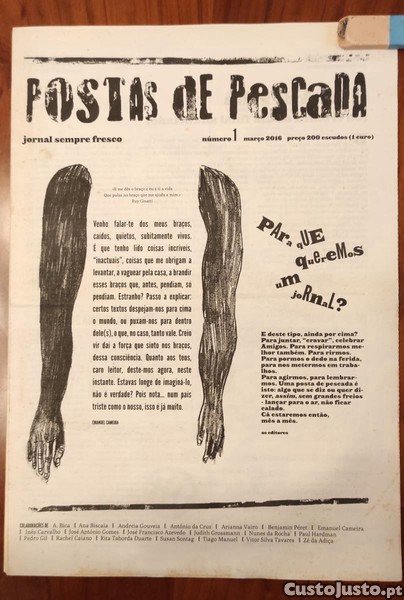 Jornal sempre fresco. Lisboa, N 1, Março de 2016, ao n 10, Dezembro de 2016. Editado por Ana Biscaia e Emanuel Cameira. Muita e valiosa colaboração, entre outros e outras, de Amadeu Baptista, Ana Biscais, André Gouveia, André Lemos, Emanuel Cameira, Graça Martins, Inês Dias, Isabel de Sá, Joanna Latka, Jorge Silva Melo, Júlio Henriques, Luiz Pacheco, Miguel de Carvalho, Nunes da Rocha, Paulo da Costa Domingos, Pedro Eiras, Rita Taborda Duarte, Rui Caeiro, Sérgio Godinho, Vitor Silva Tavares, zé da Adiça, etc., etc., etc. Cada número contém um encarte em separado, cada um destes com ilustrações a preto e branco e a cores de Arianna Vairo, Benoit Guillhaume, Izidro Ferrer, Joanna Hellgren, Mariana Zanetti, Nacho Tatjer, Nino Biniash, Paul Hardman e Simji Park. Tudo quanto foi publicado, com todos os exemplares sem dobras a meio e sem amarelecimento do papel de jornal, portanto um conjunto em excelente estado.