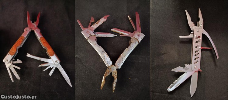 3 alicates multiuso em bom estado todos funcionais apesar das marcas da idade o maxam esta como novo e o de cabo de madeira tem bolsa que nao esta nas fotos o valor pedido é para os 3 mas posso vender separado mediante proposta