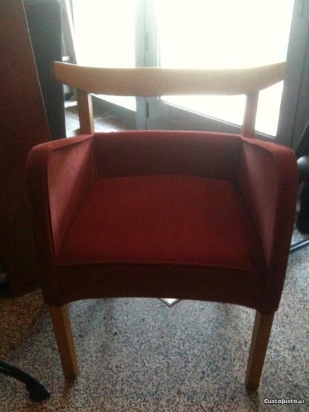 57 cadeirões com encosto de madeira de cor clara e com tecido de veludo de cor bordeaux.