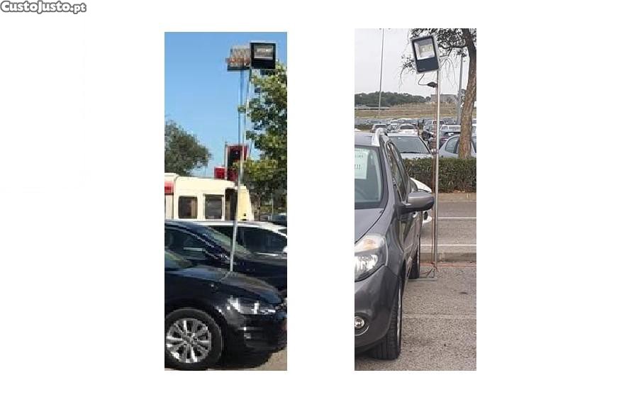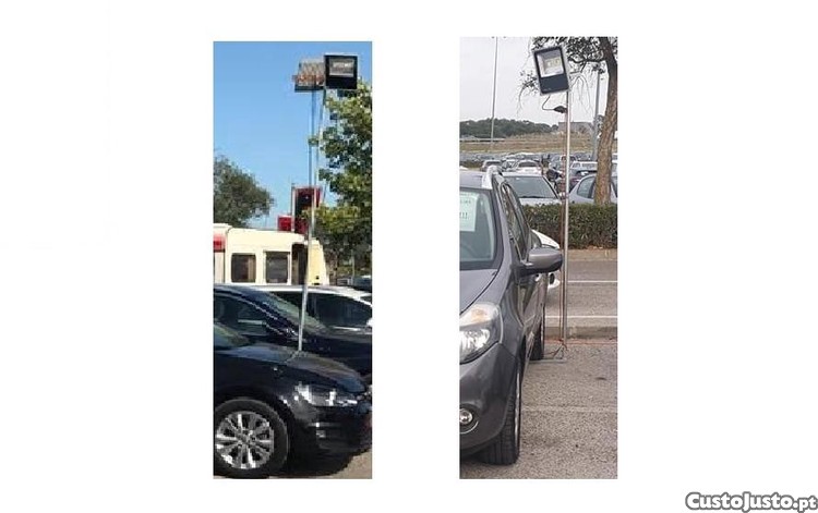 8 conjuntos de suporte de roda e tubo com 3 metros para suportar holofotes era utilizado em feiras mais 1 Tubo em ferro com 3 metros. A primeira fotos são exemplo idênticos levantamento e entrega em Alhos Vedros concelho da Moita