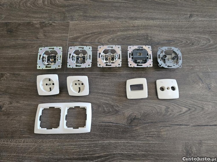 Lote com aparelhagem da marca Legrand, composto por 3 tomadas schuko, uma sem frontal, 1 tomadas RITA, 1 Tomada de Tv Televés, 1 espelhos duplos, modelo Suno, da cor Creme. Entrego em mão no Barreiro ou envio com portes pagos ANTECIPADAMENTE pelo comprador.
