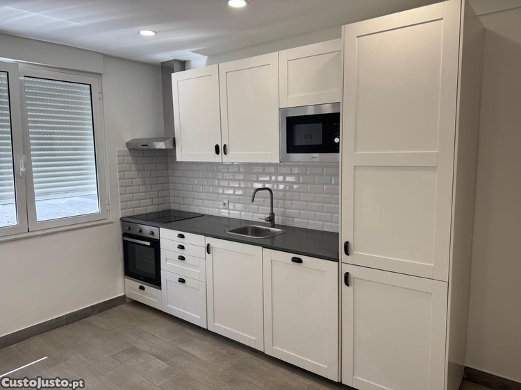 Cozinha feita à medida, totalmente equipada (forno, placa, micro-ondas de encastre, combinado embutido, máquina de lavar loiça e máquina de lavar roupa);