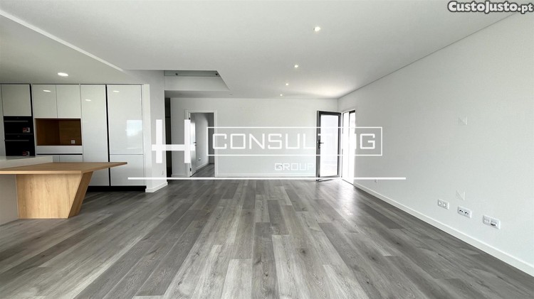Apartamento T3 no rés do chão em prédio com elevador, composto por 3 quartos, sendo um deles suíte, uma casa de banho comum, e zona social em open space com sala e cozinha totalmente equipada.