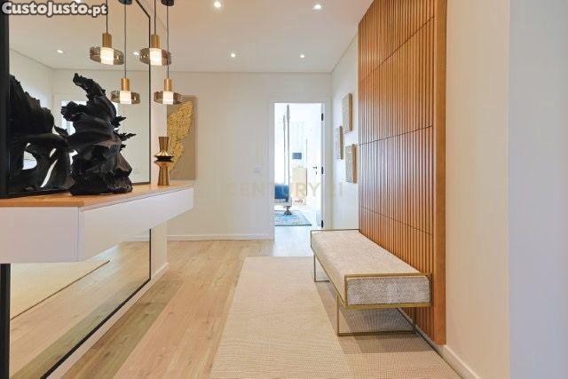 O apartamento apresenta uma distribuição inteligente, com 4 quartos, incluindo uma suíte, 3 casas de banho, uma cozinha equipada com eletrodomésticos modernos, e uma sala de estar espaçosa com acesso a varandas que proporcionam uma excelente exposição à luz natural. Com acabamentos de alta qualidade, como chão em madeira e paredes pintadas, este espaço é ideal para famílias que valorizam conforto e elegância.