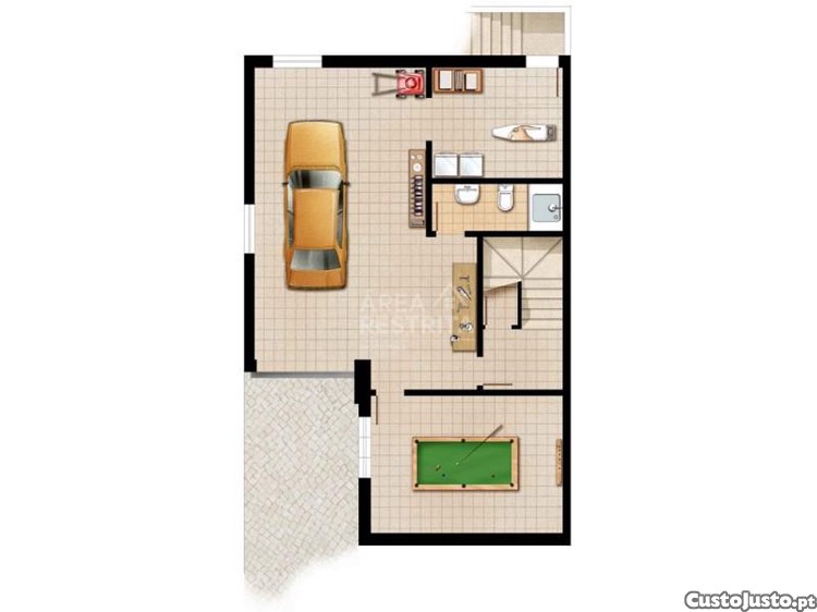Piso -1: Garagem para 2 carros, espaço que pode ser um escritório ou zona de arrumos, lavandaria e WC.