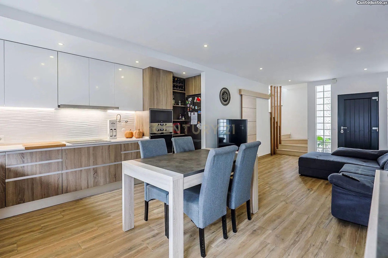 No rés-do-chão, a cozinha em conceito open space funde-se com a sala de estar, criando um ambiente amplo e perfeito para receber amigos e família. A cozinha fica equipada com placa, forno, micro-ondas e exaustor, ideal para quem valoriza funcionalidade no dia a dia. Este piso conta ainda com uma casa de banho de apoio e acesso direto ao quintal, onde poderá desfrutar de refeições ao ar livre ou criar um espaço de lazer único.