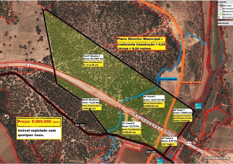 VER FOTOS COM AS VÁRIAS PROPRIEDADES, RESPECTIVAS ÁREAS TOTAIS, ÁREAS CONSTRUTIVAS PERMITIDAS, ACESSOS RODOVIÁRIOS, RIO SADO, CANAL DE IRRIGAÇÃO, PREÇOS, ETC