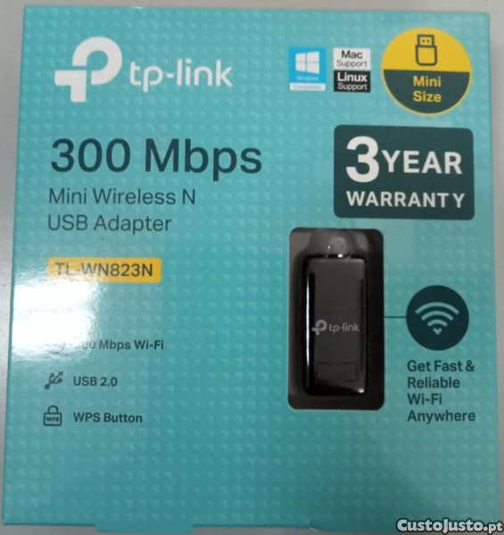Mini Wireless USB 2.0, 300 Mbps, ref TL-WN823N (TP-LINK), no estado de praticamente nova, uma vez que só foi usada para testar o equipamento e depois não foi necessária a sua utilização.