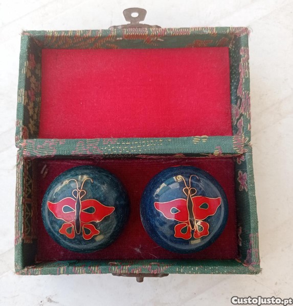 São pequenas bolas oriundas da medicina tradicional chinesa, utilizadas como bolas anti stress, diminuem a ansiedade, exercitam os músculos das mãos, dos braços e dos ombros e estimulam a circulação sanguínea. Quando são manuseadas, emitem um som relaxante. Bastante coloridas. Geralmente são guardadas numa caixa com duas bolas. Vendo a EUR 22