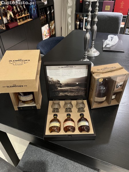 Duas glenrothes mais o raríssimo tasting set com 3 copos glencairn em box de madeira