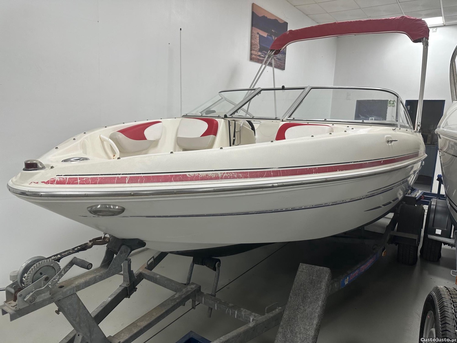 Glastron MX 185, ano construção 2009, 1 registo 11/08/2010, motor Mercruiser 3.0 MPI, 135 HP, comprimento 5,21m, boca 2,24m, lotação 8 pessoas, atrelado Luis Figueiredo com travão e matricula própria, plataforma de banhos, capas de proa e poço, bimimi top, sonda/GPS Humminbird 383c, auto extinção de incêndios, pintura anti vegetativa, bomba de fundo automática, radio Sony com Bluetooth, palamenta e registo classe 5, vistoria válida até 2030, IUC 2025 liquidado (295EUR)