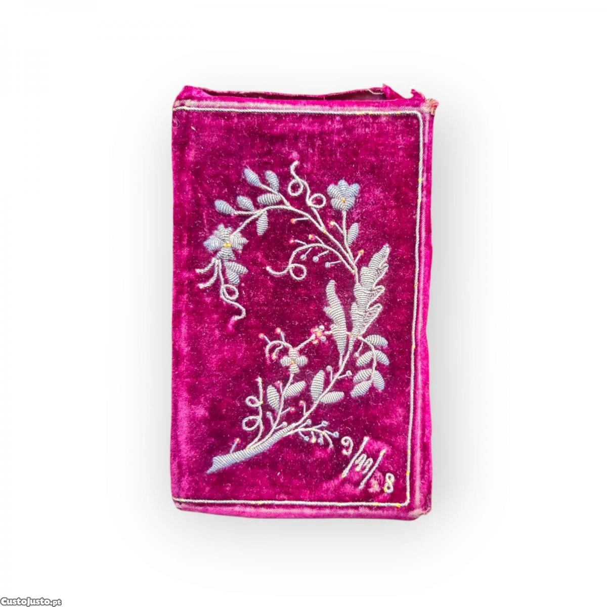 Esta delicada capa em veludo magenta, ricamente bordada à mão com fios prateados, foi provavelmente usada como proteção para livros sagrados (missais) ou documentos de grande valor espiritual.
