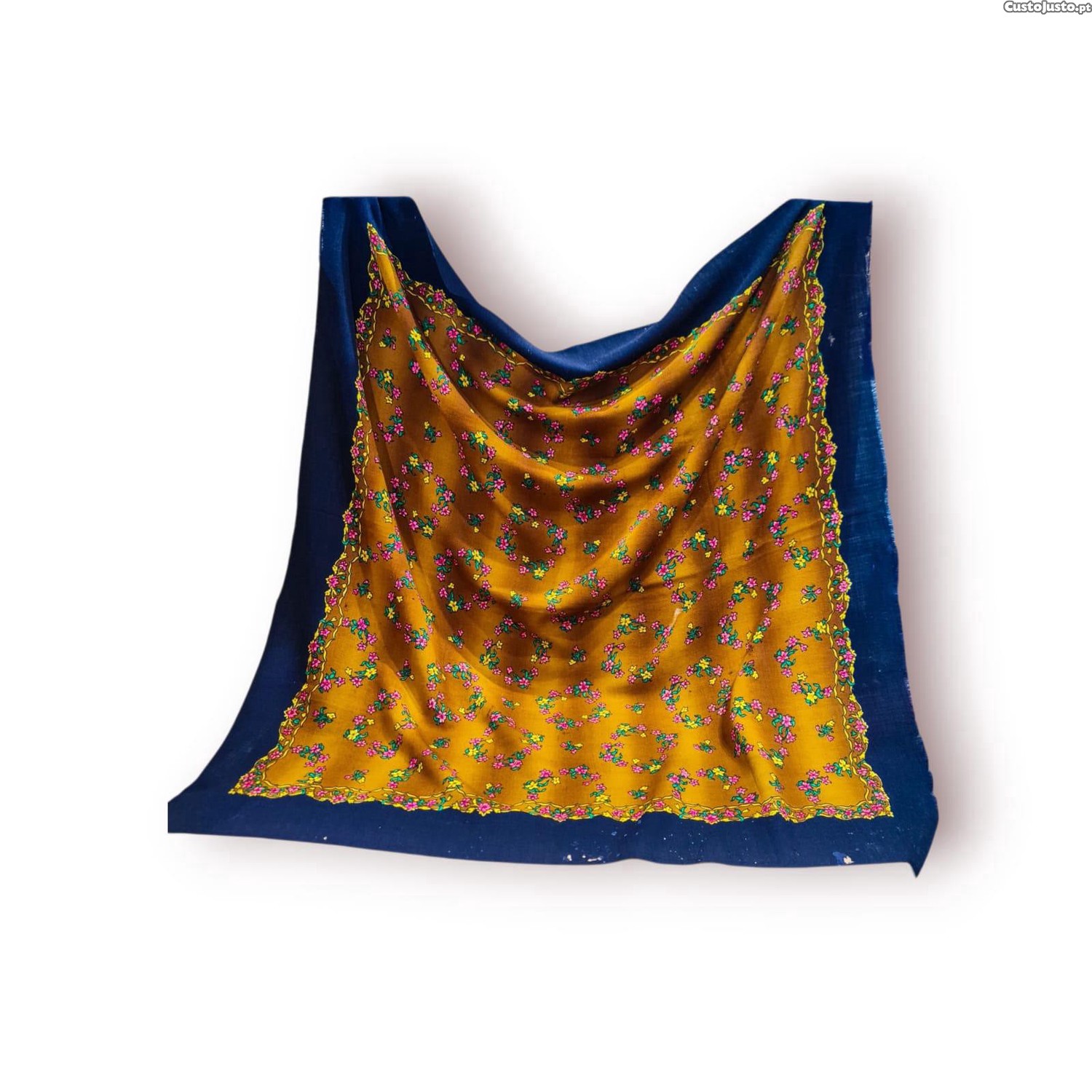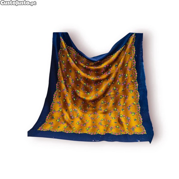 Este lenço cachené antigo é uma peça tradicional em lã, com medidas de 98×92 cm. Apresenta uma elegante combinação de azul-marinho com fundo castanho, decorado com padrões florais coloridos em rosa, amarelo e verde. É uma peça de forte carácter popular e cultural, ideal tanto para colecionadores como para uso decorativo ou vestimenta típica.