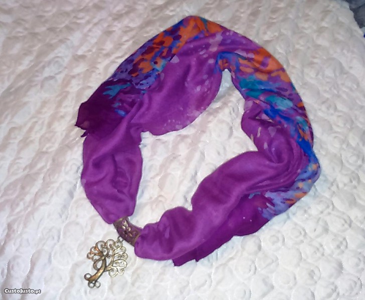 Lenço com pendente tipo colar, roxo com pendente de árvore da vida.