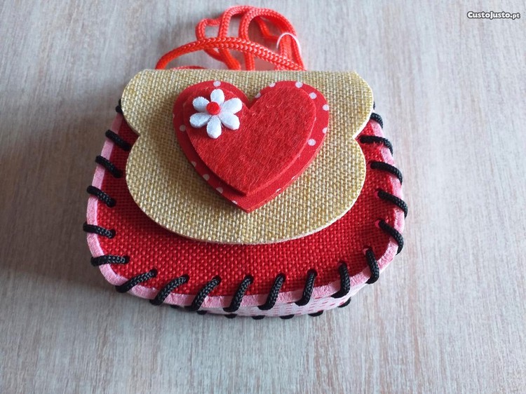 Mala de criança em tecido com alça de pôr a tiracolo. rosa, vermelho e azul. Cada uma custa 4,50 euros