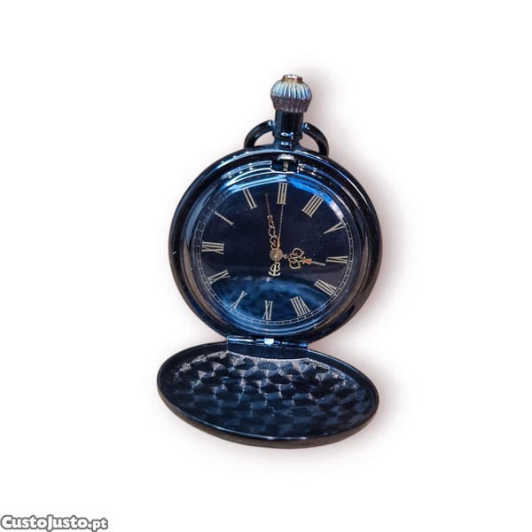 Relógio de bolso decorativo, estilo clássico, com caixa metálica preta brilhante e ornamentos em dourado no verso. A frente abre em estojo protetor, revelando mostrador preto com números romanos e ponteiros trabalhados em dourado.