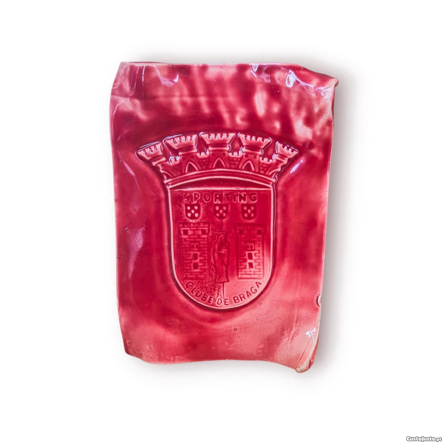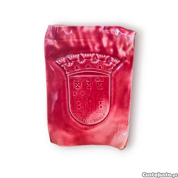 Peça em cerâmica vidrada de tom vermelho intenso, com relevo representando o brasão oficial do Sporting Clube de Braga. O verso apresenta a inscrição manual D.C. , sugerindo produção artesanal ou limitada. Um artigo com forte valor decorativo e sentimental, ideal para colecionadores e adeptos do clube minhoto.