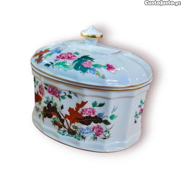 Elegante caixa em porcelana da prestigiada Vista Alegre, manufacturada em Portugal, com decoração minuciosa em motivos florais policromados e detalhes dourados. A peça apresenta corpo ovalado com tampa trabalhada e pega dourada, ideal tanto para coleção como para uso decorativo.