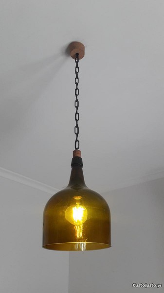 Os candeeiros são feitos a partir de garrafões de vidro usados, reciclados. Cada candeeiro é composto por; garrafão de vidro 5l usado e cortado, casquilho de vaquelite, 8cm de varão roscado, 50cm de corrente, 50cm de fio, rolha de cortiça furada, rolha de cortiça "batoque" furada e rebaixada. Desponho de 3 cores; castanho, verde e branco translúcido. A corrente e fio, podem ser alterados na altura... se necessário...