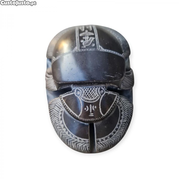 Magnífica representação de um escaravelho ritual egípcio esculpido em pedra escura, com detalhes minuciosos e hieróglifos gravados na base. Esta peça inspira-se nos amuletos simbólicos usados no Antigo Egito, que simbolizavam renascimento, proteção e ligação com os deuses. Os escaravelhos eram frequentemente colocados sobre o coração dos mortos para garantir a passagem segura para a vida após a morte, sendo considerados poderosos talismãs de proteção.