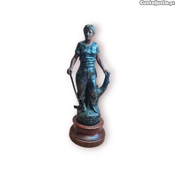 Peça decorativa representando um jovem lenhador ( Bûcheron , em francês), trabalhada em metal com pátina em tons de verde e castanho. A escultura apresenta o detalhe do machado na mão direita e o tronco a seus pés, assente sobre uma elegante base em madeira marmoreada.