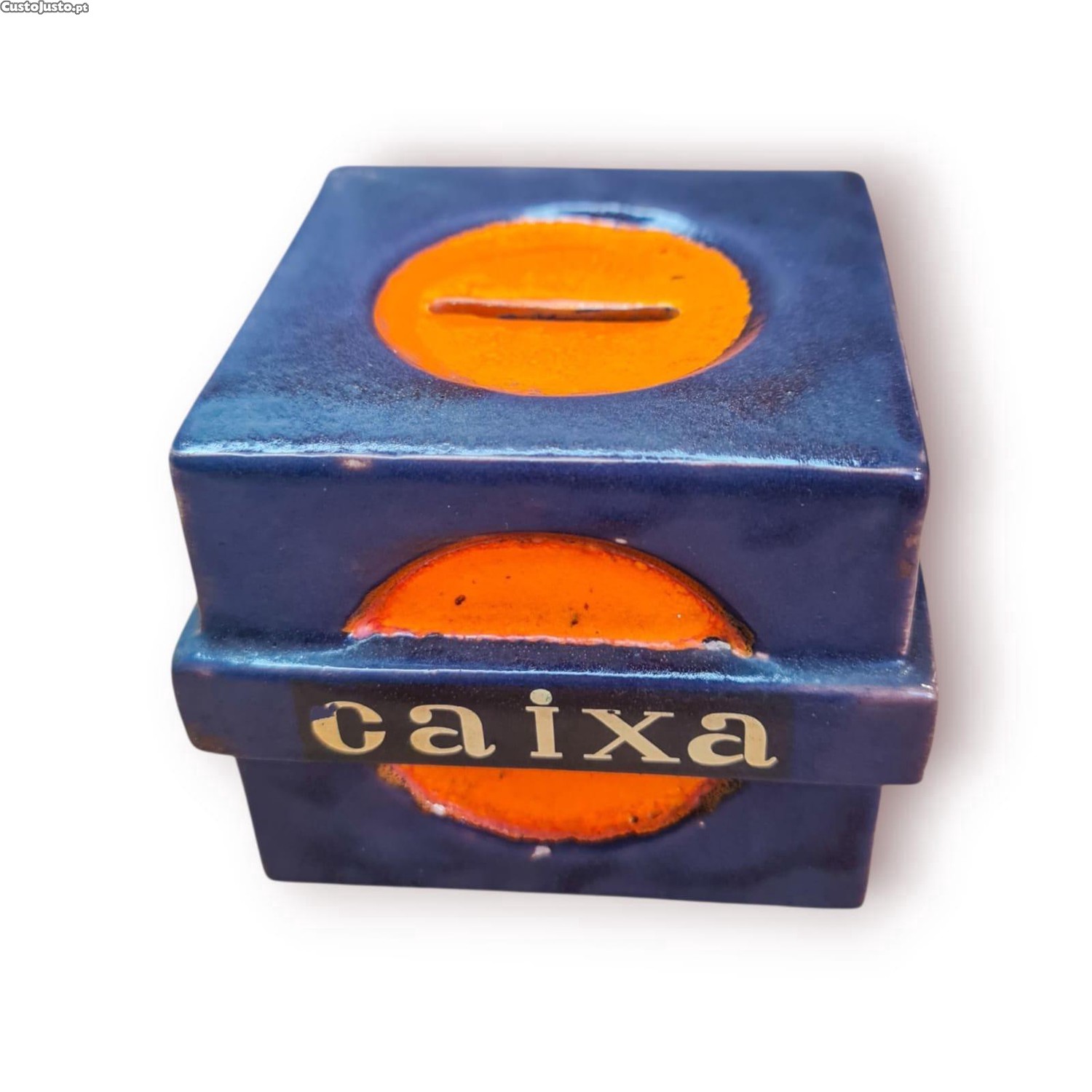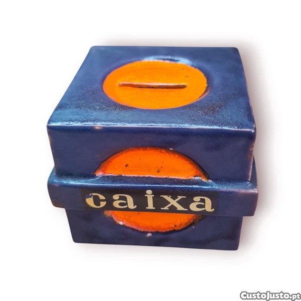 Peça vintage de colecionismo publicitário: mealheiro em faiança com esmalte azul cobalto e relevos circulares laranja. Em cada face, a sequência tipográfica caixa / de / depósitos / geral . Formato cúbico com estética modernista, ideal para decoração retro e para colecionadores de cerâmica portuguesa e memorabilia bancária.