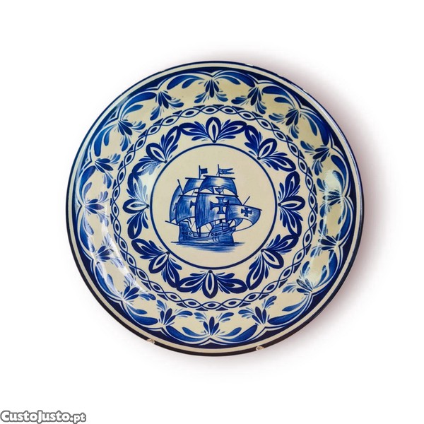 Prato de parede/centro de mesa da Vianagrés (Viana do Castelo, Portugal), inteiramente pintado à mão no tradicional azul-cobalto, com motivo de caravela ao centro e cercadura floral. Na base apresenta inscrição manuscrita Vianagrés Viana do Castelo Portugal Hand Painted Lito . Peça decorativa com forte identidade portuguesa, ideal para realçar uma parede ou aparador.