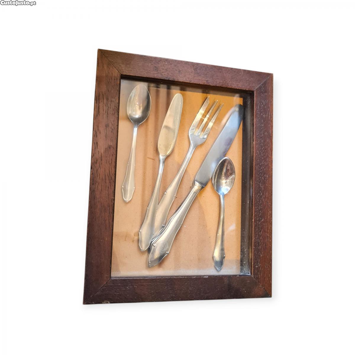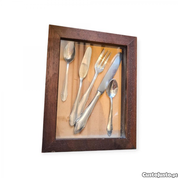 Peça decorativa rara com talheres históricos marcados com o selo da Marinha de Guerra Portuguesa. O conjunto é composto por cinco peças (colheres, facas e garfo), montadas em quadro com moldura em madeira e vidro frontal. Item com potencial colecionável, de valor histórico e visual forte.