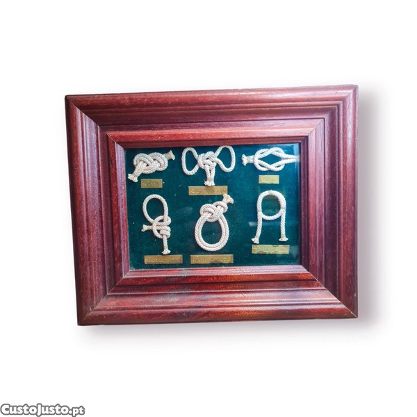 Exclusiva peça vintage de arte náutica apresentando seis nós marinhos típicos, habilmente amarrados em corda natural e montados sobre fundo em tecido verde escuro. O conjunto está disposto dentro de uma moldura de madeira com vidro frontal, ideal para decoração de ambientes com tema náutico ou colecionadores de memorabilia marítima.