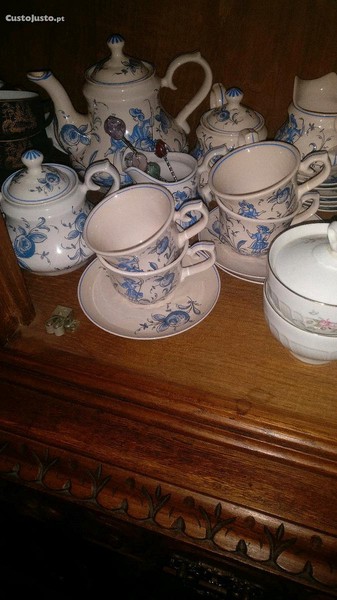 Pintado a mão. Serviço completo, chávenas, Pires, bule, açucareiro e leiteira em porcelana, (louca! Águeda) "