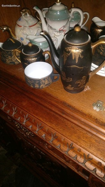 Serviço de chá e de café antigo com chineza no fundo, perto.... Verde..Pires chávenas, açucareiro. Leiteira e respetivo bule, tudo completo